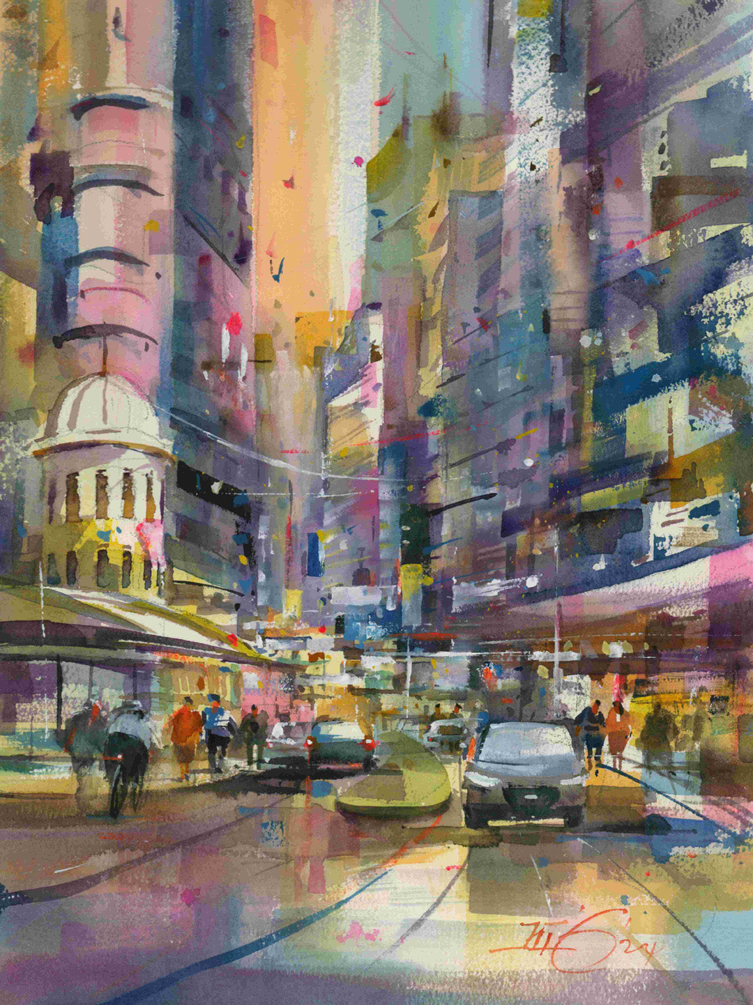 Afternoon Light Lambton Quay - original watercolour by Kit Ong
