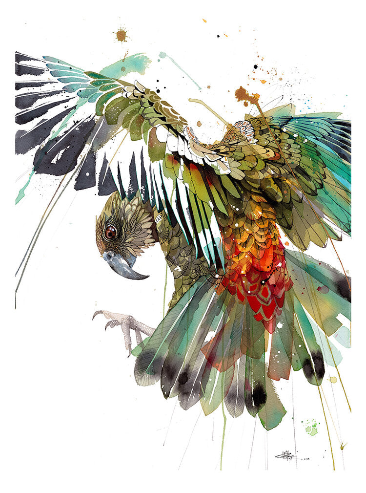 Rachel Walker is renowned for her beautiful watercolour and pen and ink artworks that draw on her awe of New Zealand’s beautiful nature, in particular our native birds and bush. Her drippy, energetic style is both loose in form and precisely detailed, capturing the attitude and beauty of our birds, sea creatures and reptiles. Born and raised in the beautiful seaside town of Napier, Rachel trained at Massey University in Wellington after which she has developed her own unique style and her successful career to date has included many solo gallery exhibitions, creating art for conservation organizations such as Forest and Bird, collectible postage stamps, collaborations with interior designers for commercial fit-outs, album covers, beverage labels, and a stint living and painting in rural France.