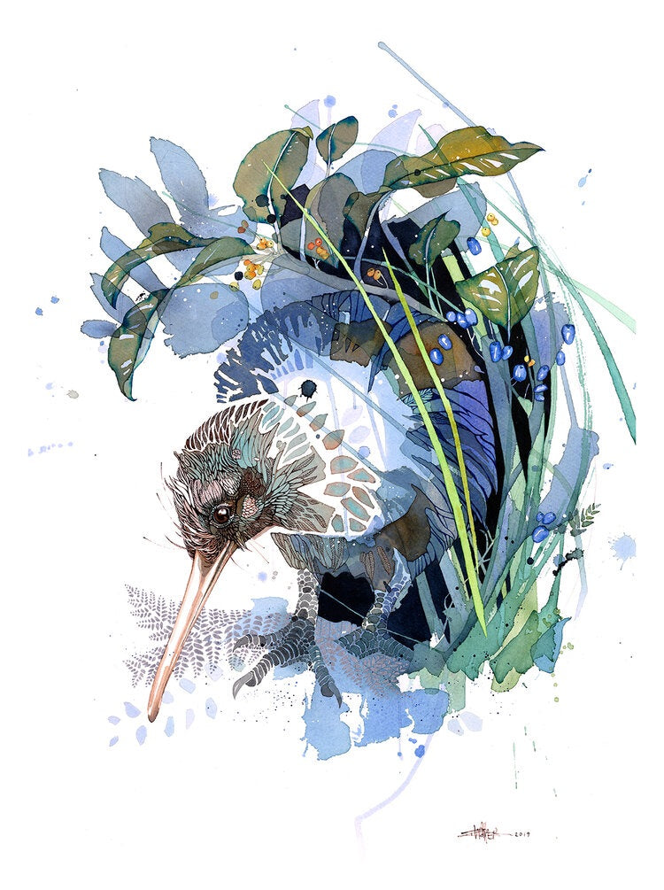Rachel Walker is renowned for her beautiful watercolour and pen and ink artworks that draw on her awe of New Zealand’s beautiful nature, in particular our native birds and bush. Her drippy, energetic style is both loose in form and precisely detailed, capturing the attitude and beauty of our birds, sea creatures and reptiles. Born and raised in the beautiful seaside town of Napier, Rachel trained at Massey University in Wellington after which she has developed her own unique style and her successful career to date has included many solo gallery exhibitions, creating art for conservation organizations such as Forest and Bird, collectible postage stamps, collaborations with interior designers for commercial fit-outs, album covers, beverage labels, and a stint living and painting in rural France.